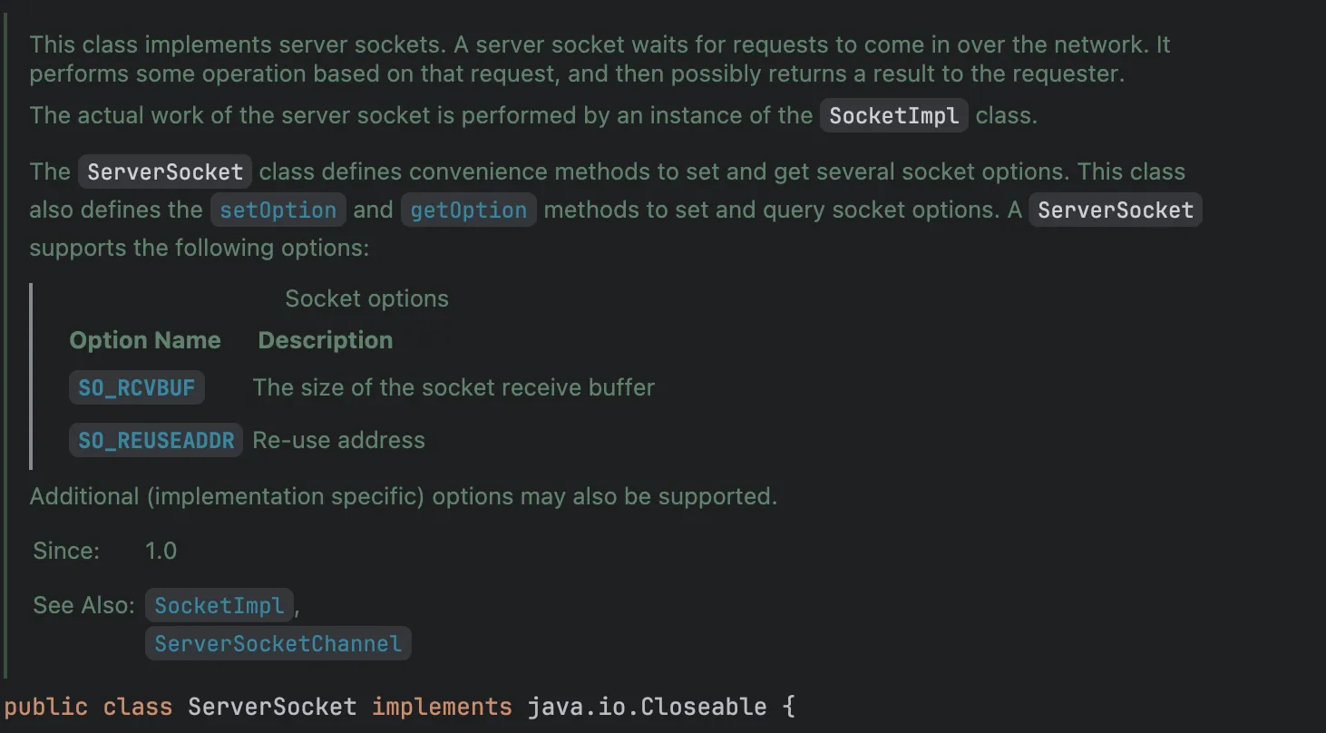 TCP측 구현체로는 java.base 모듈 java.net 패키지에 Socket 클래스와 ServerSocket 클래스가 있습니다. (UDP는 DatagramSocket 클래스가 따로 존재합니다)
