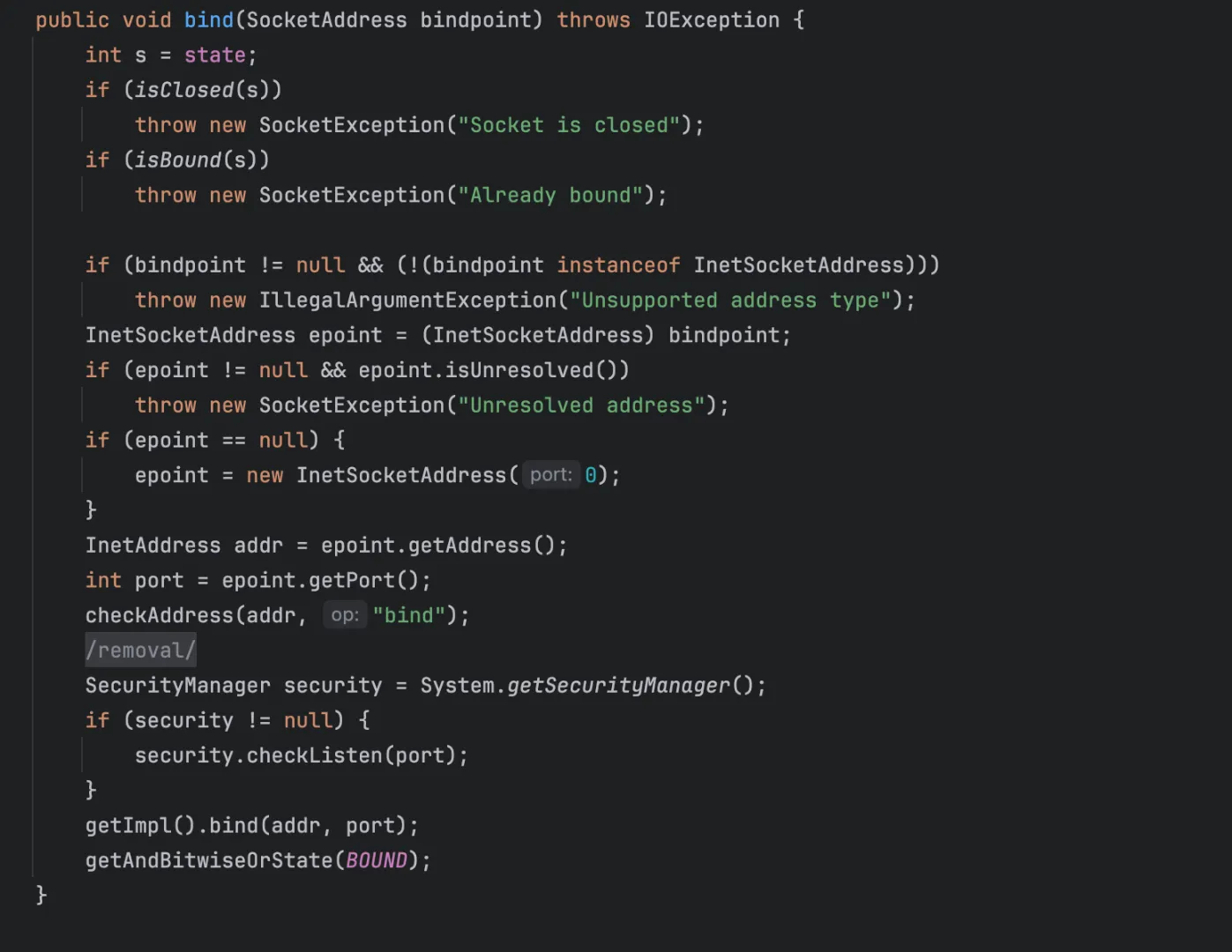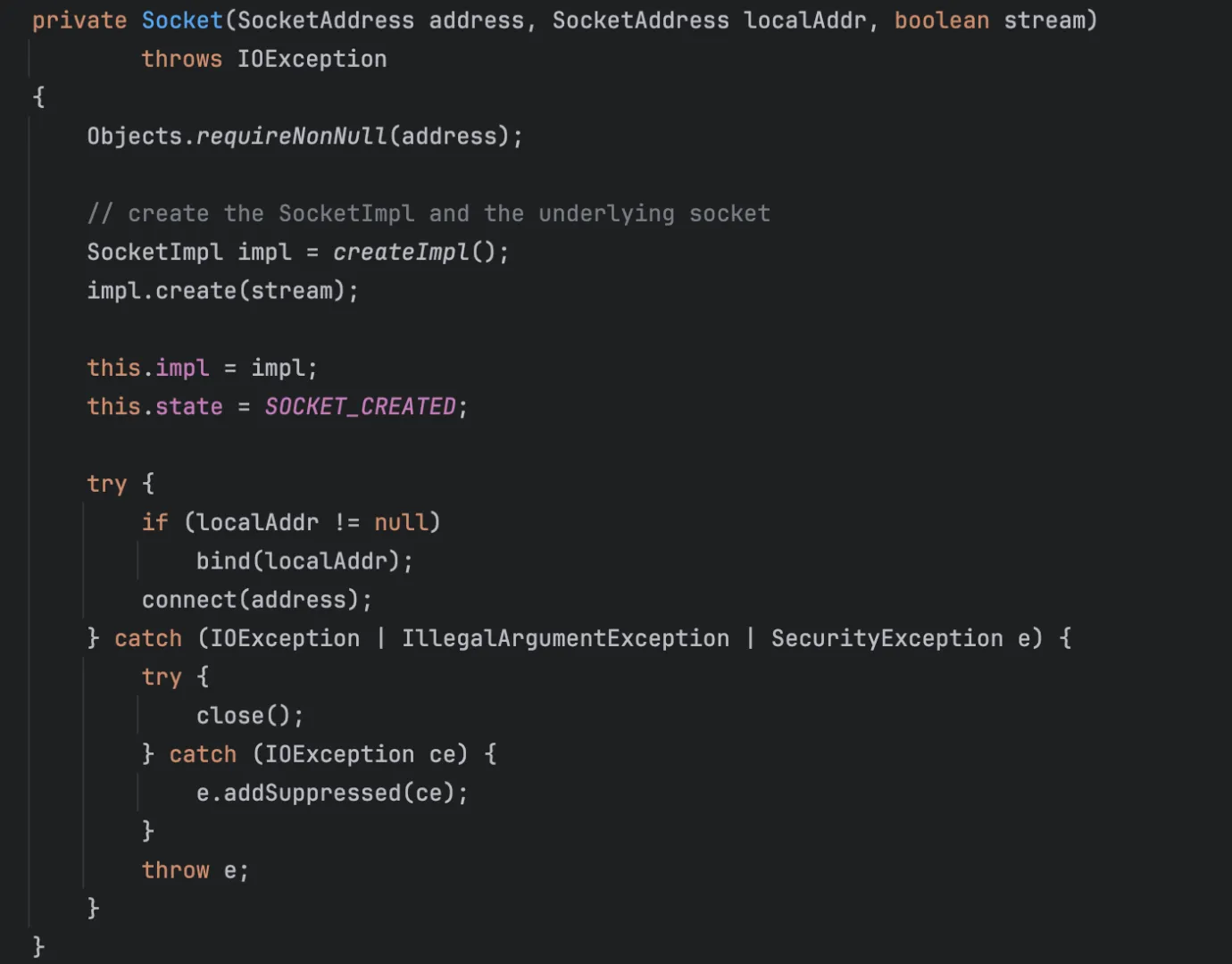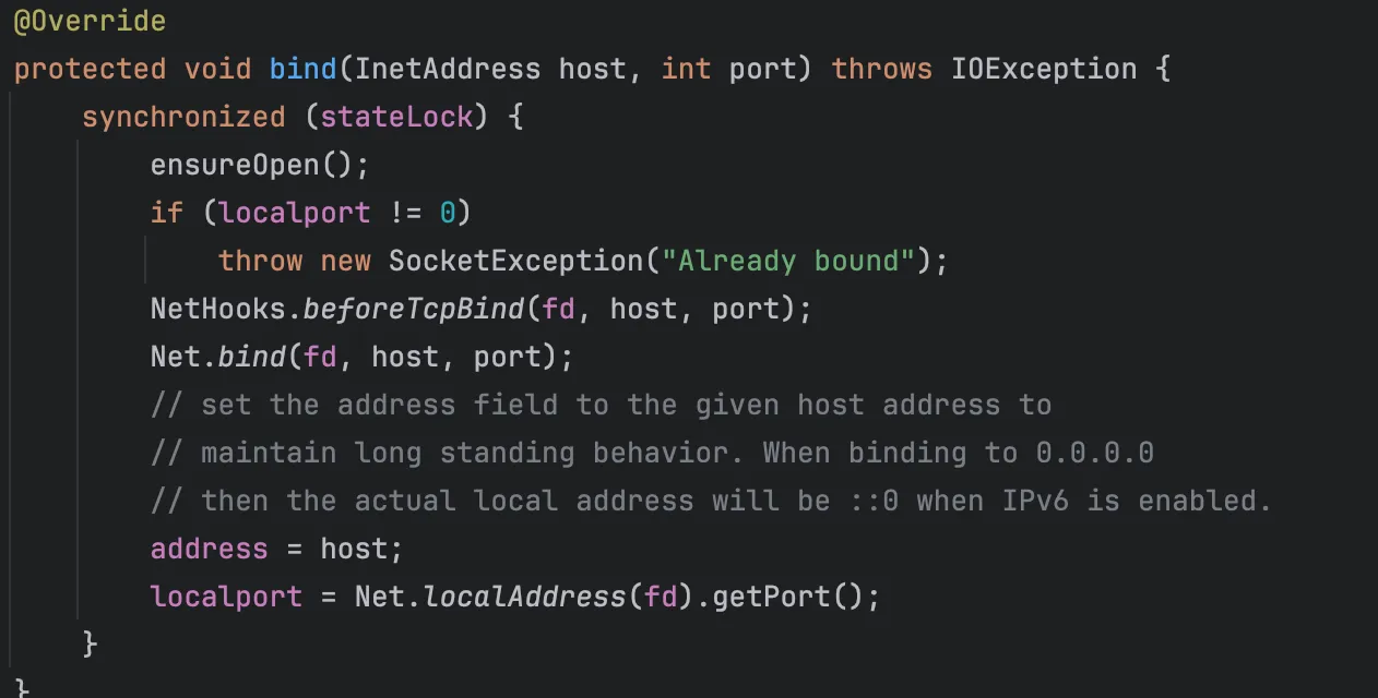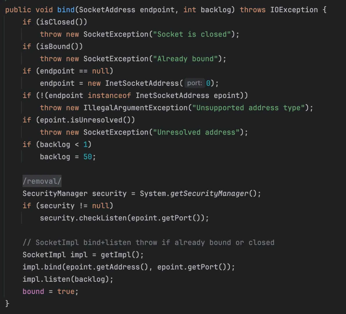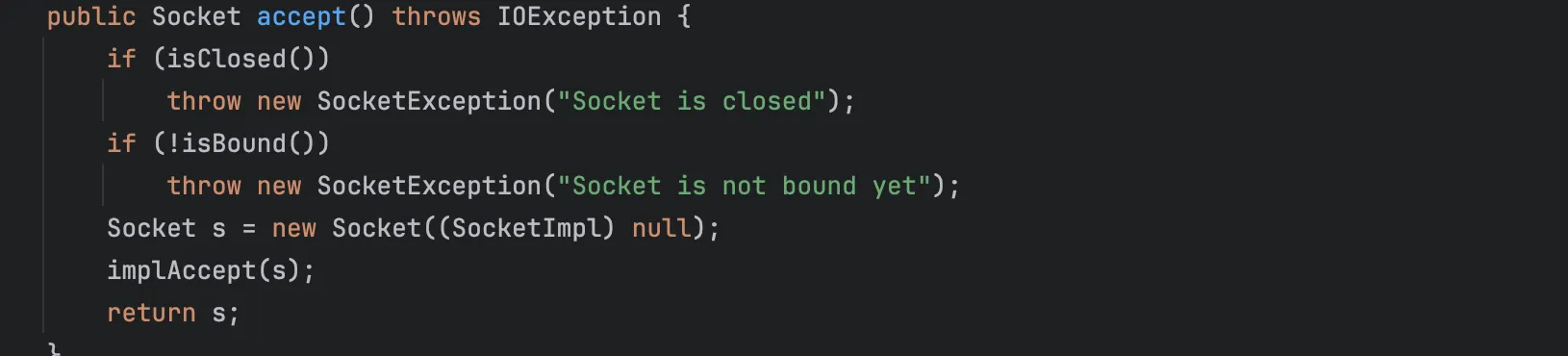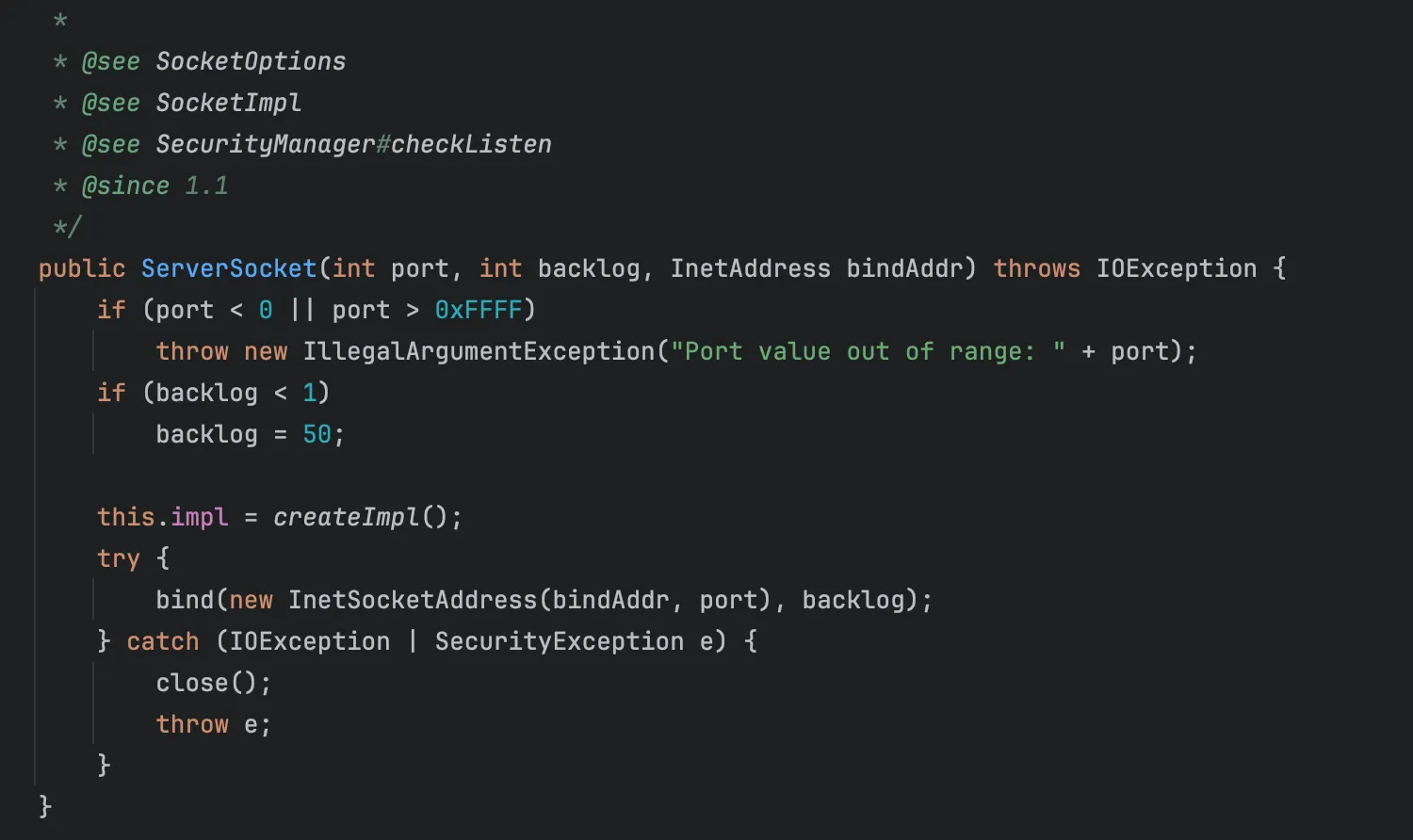 생성자에서 C단의 bind와 listen 호출에서 사용되던 파라미터를 객체지향적으로 생성자에서 받고 있습니다. Impl 생성 로직은 일반 Socket과 동일해 기본적으로 NioSocketImpl을 사용합니다.