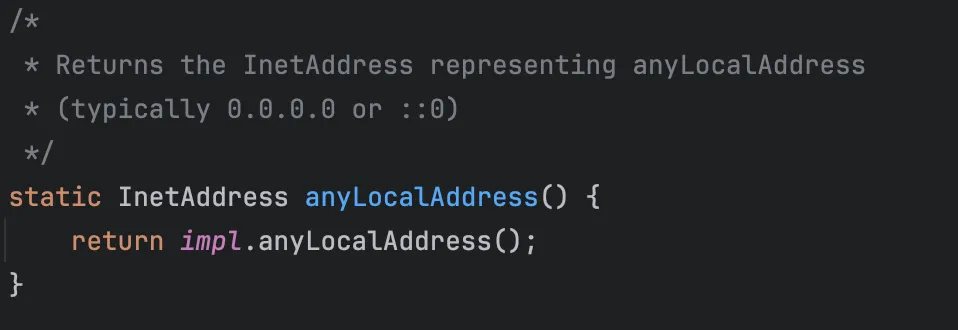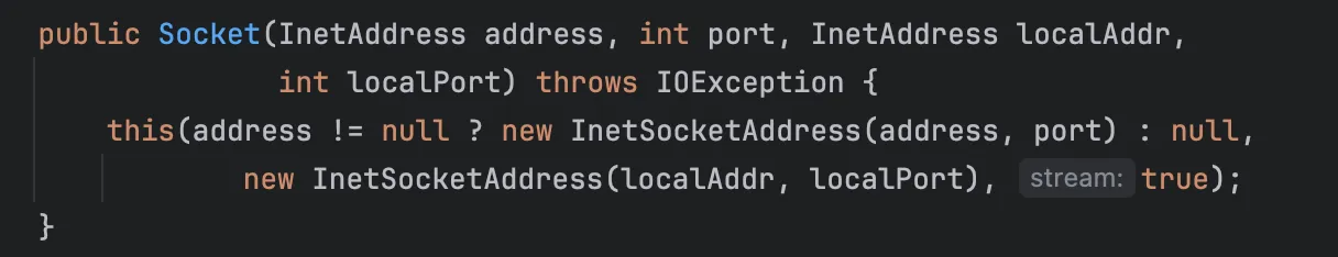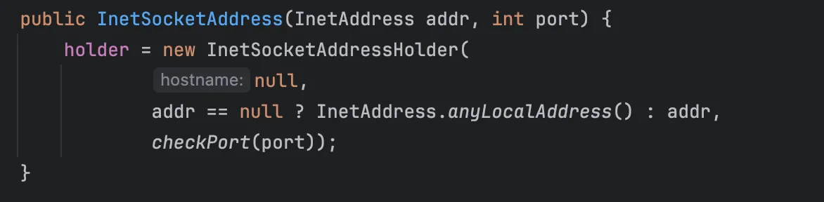 노출된 public 생성자를 보면 로컬 주소 바인드 로직도 보입니다. 여기서 주소에 해당하는 건 로컬 IP로 보통 NIC까지 세밀하게 제어를 하지 않으니 빈 값을 줍니다.