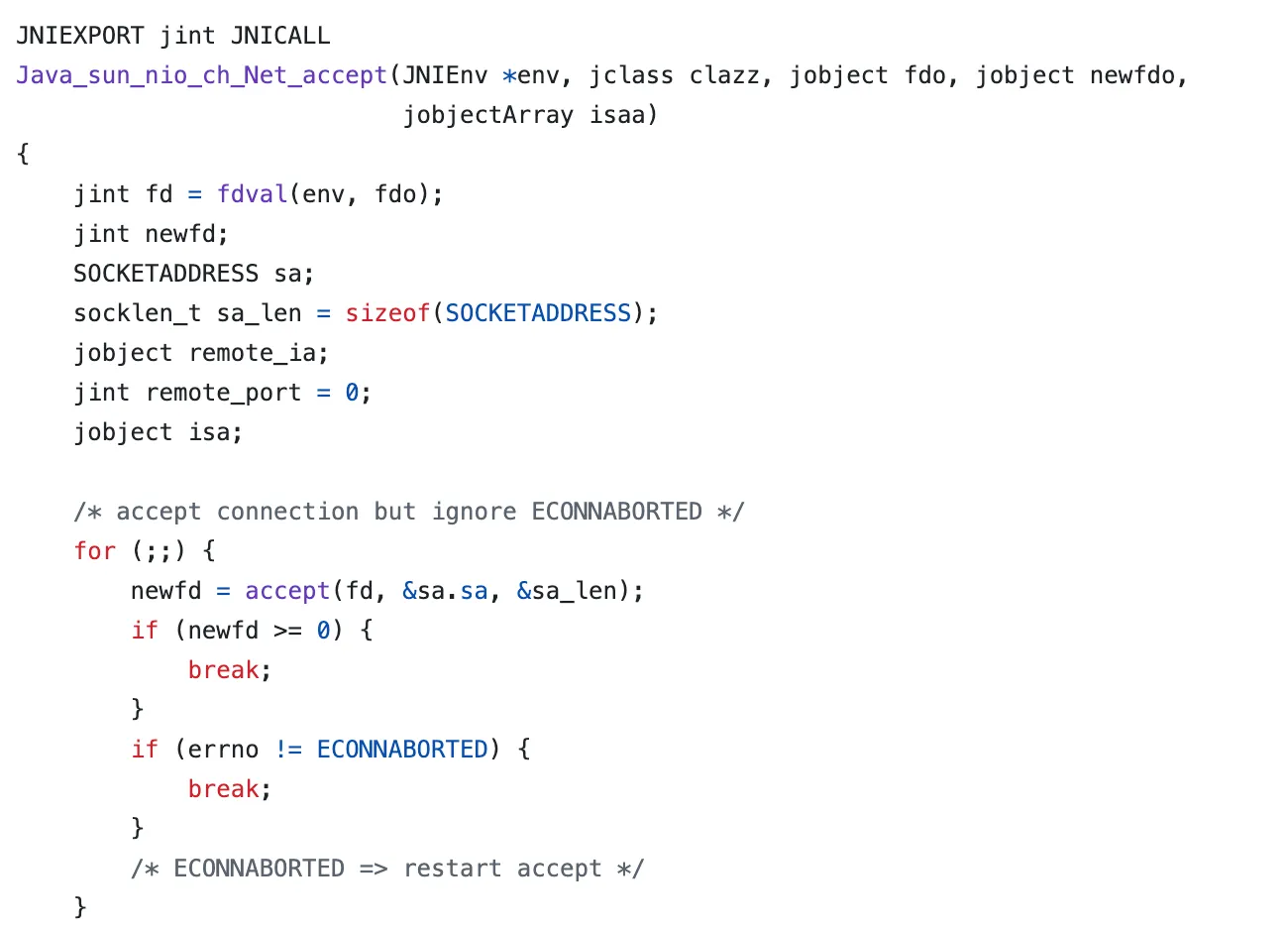 타고타고 가면 나오는 native accept의 Unix 쪽 구현체입니다. Socket API accept함수를 호출하고 있고, 앞서 살펴 봤듯 native socket api의 accept 함수가 블로킹 함수여서 결국 자바에서 accept를 호출하면 현재 스레드를 블로킹합니다.