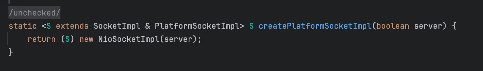 주로 직접 생성 시 NioSocketImpl을 사용합니다. ServerSocket과 Socket 클래스 모두 동일하고 NioSocketImpl엔 JNI, native 키워드로 함수들이 정의되어 있으며 JDK 내부 C++ 함수를 실행하고, C++ 함수에선 운영체제에 맞는 Socket 관련 시스템 콜을 C Wrapper 함수로 호출 합니다.