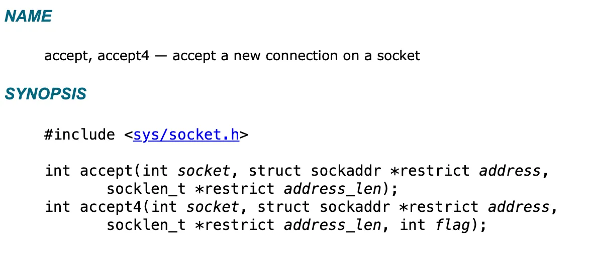accept()는 Accept Queue에서 대기 중인, 완전히 연결이 수립된 클라이언트를 꺼내오는 함수입니다. 큐에서 연결을 성공적으로 꺼내오면, accept()는 통신을 위한 새로운 소켓을 생성하여 반환합니다. 블로킹 함수로 연결이 없는 경우 대기합니다.