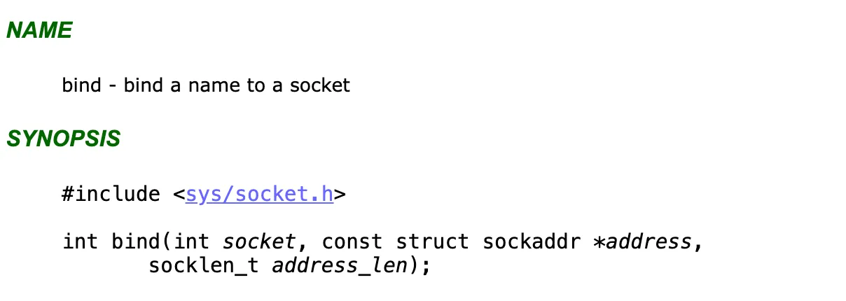 bind는 소켓에 주소, 즉 IP주소와 포트를 바인딩합니다. 소켓이 어떤 로컬 IP와 포트를 사용할지를 운영체제에 알려주는 것이라 볼 수 있습니다. 여기서 IP주소는 소유한 NIC의 IP입니다.
