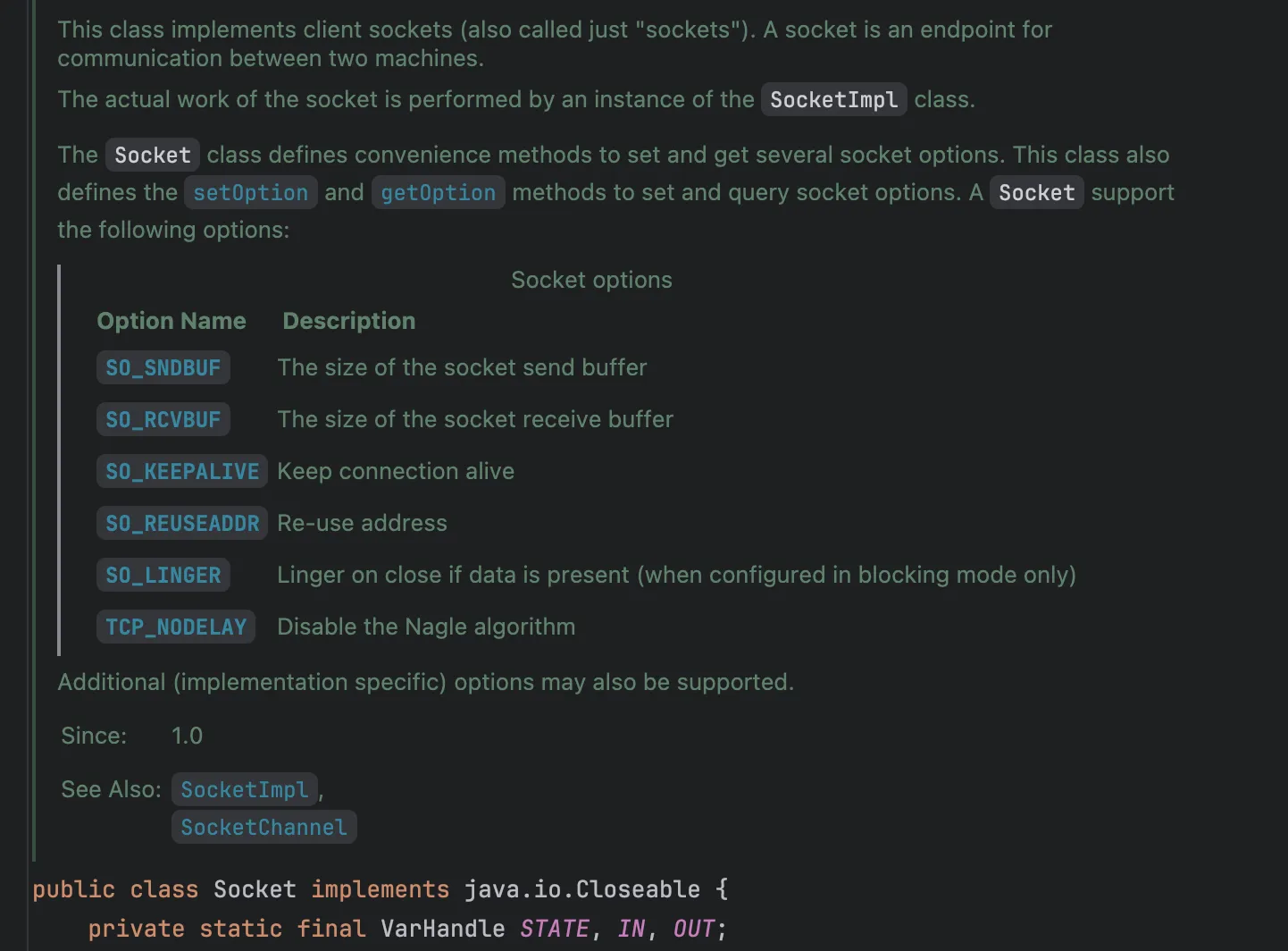 바로 이 클래스입니다. 이름만 보면 Socket을 상속받았을 것 처럼 생겼지만 위계관계에서 전혀 별도의 class 인 것을 알 수 있습니다.