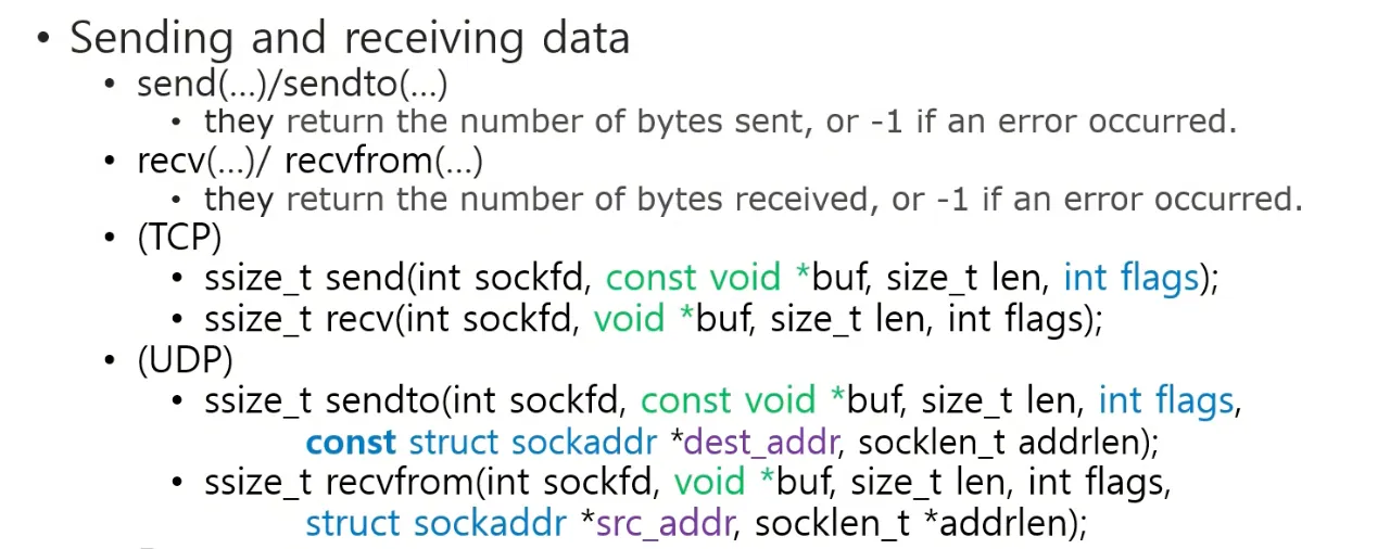 앞서 본 연결과 관련된 함수들과는 독립적입니다. send와 sendTo 혹은 recv와 recvFrom이 있는데 차이는 주소 구조체를 받냐 안받냐 입니다. 연결을 맺어 놓은 상태(TCP) 면 목적지 명시 없이 send/recv 호출을 통해 연결해둔 목적지로 통신이 가능합니다.