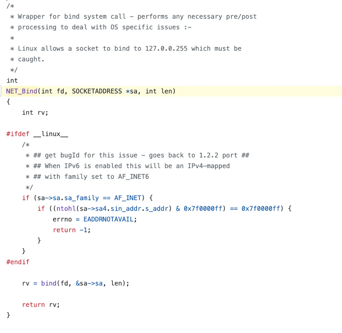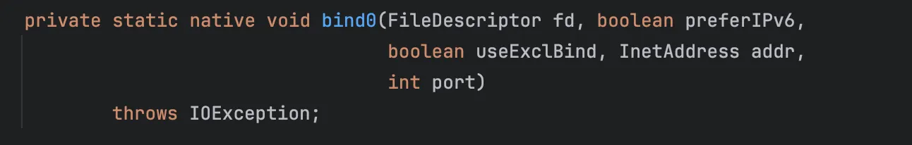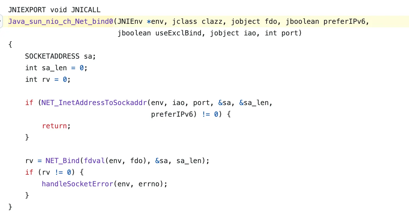최종적으로 JNI를 통해 C++로 실제 SocketAPI의 bind()를 호출합니다. 로컬 포트가 없다면 여기서 시스템콜로 받아옵니다.