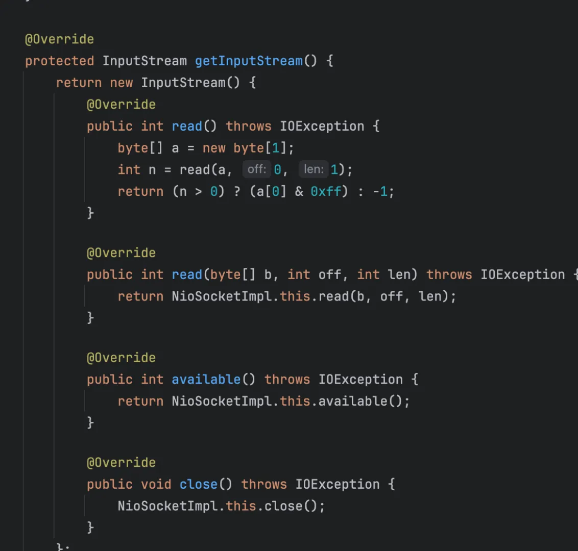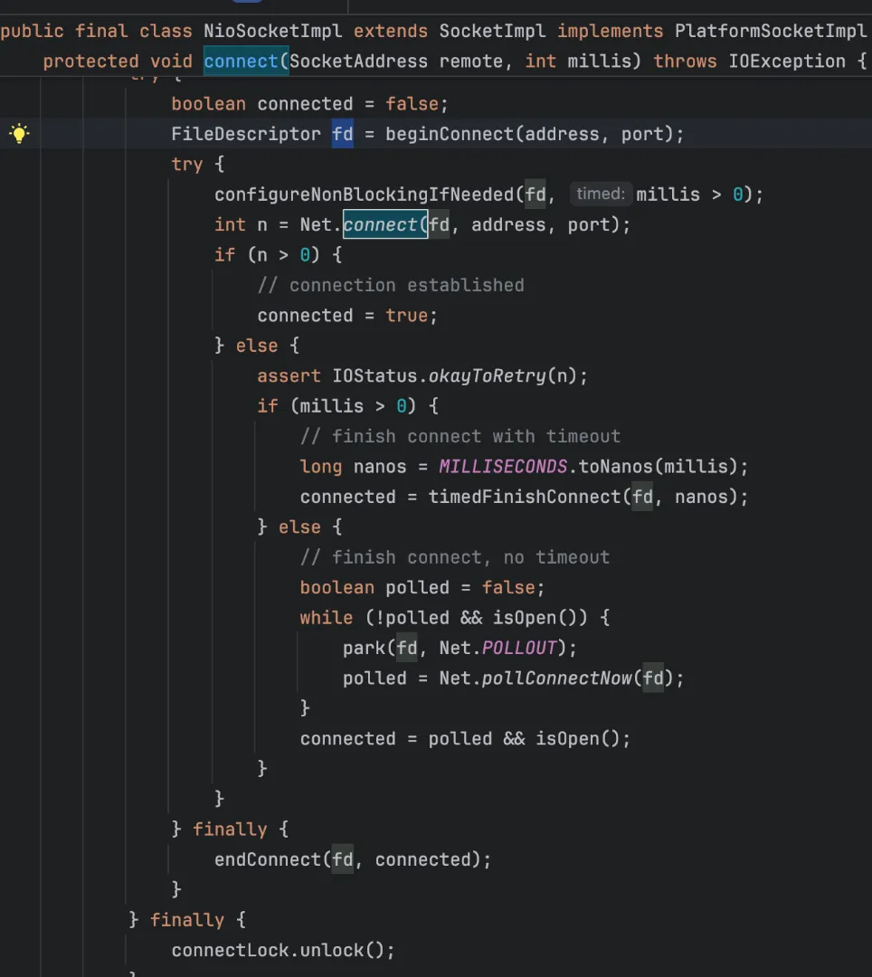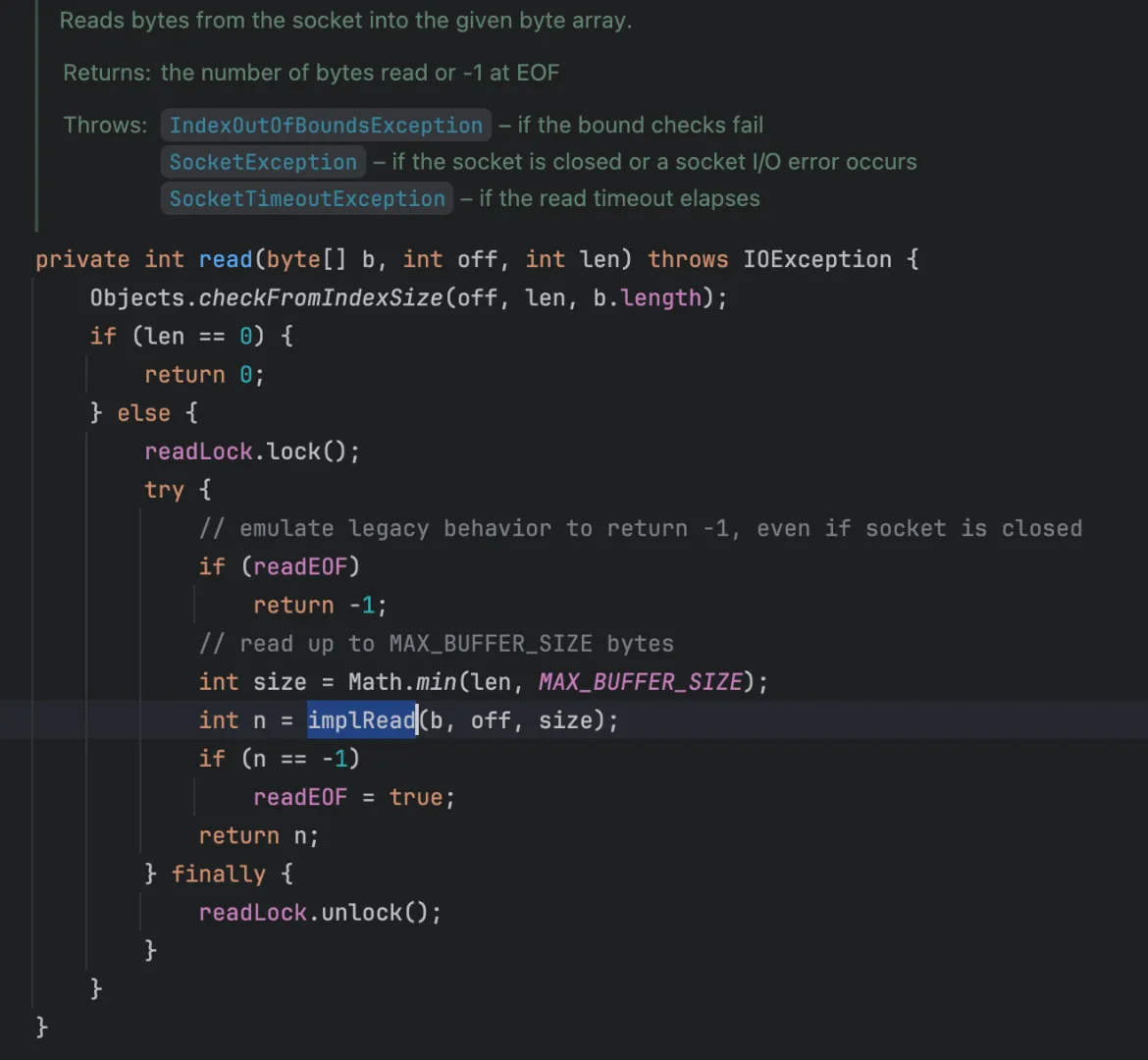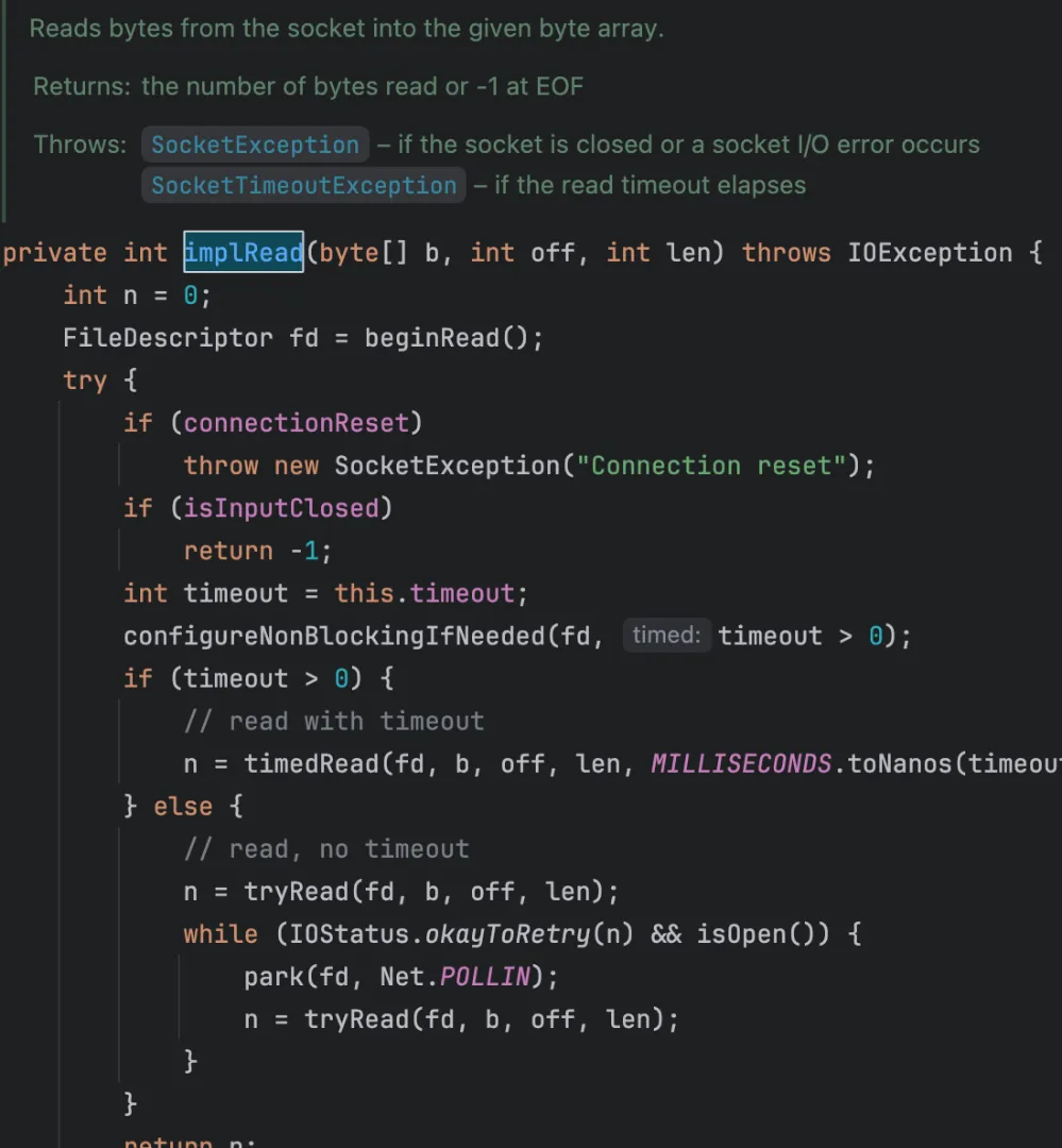 주로 직접 생성 시 NioSocketImpl을 사용합니다. ServerSocket과 Socket 클래스 모두 동일하고 NioSocketImpl엔 JNI, native 키워드로 함수들이 정의되어 있으며 JDK 내부 C++ 함수를 실행하고, C++ 함수에선 운영체제에 맞는 Socket 관련 시스템 콜을 C Wrapper 함수로 호출 합니다.