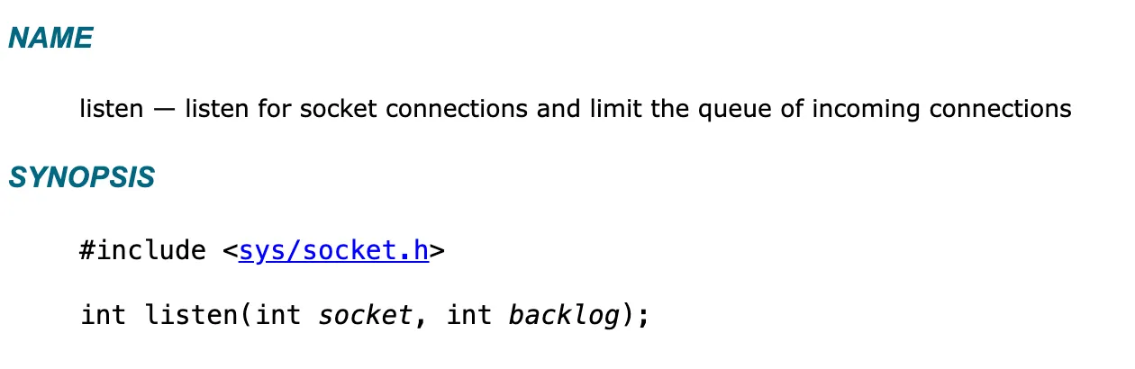 listen은 클라이언트로 부터 소켓을 받을 준비를 합니다. 이때부터 클라이언트의 connect 요청을 받을 수 있게 되며 핸드셰이킹이 완료된 통신들은 Accept Queue에서 대기하며 accept 함수를 호출할 때 까지 대기합니다. backlog 값을 통해 이 큐의 값을 지정할 수 있습니다.