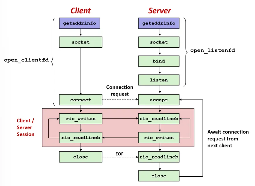 accept()는 Accept Queue에서 대기 중인, 완전히 연결이 수립된 클라이언트를 꺼내오는 함수입니다. 큐에서 연결을 성공적으로 꺼내오면, accept()는 통신을 위한 새로운 소켓을 생성하여 반환합니다. 블로킹 함수로 연결이 없는 경우 대기합니다.