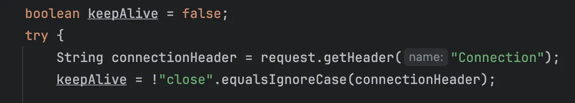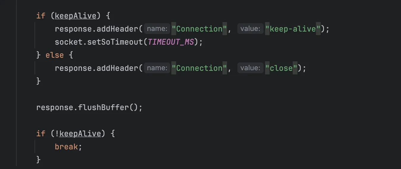 KeepAlive이면 서버측 헤더도 keep-alive를 붙여줍니다. flushBuffer로 응답을 보낸 후 KeepAlive가 아니라면 while 루프를 탈출합니다. 아닌 경우 일련의 과정을 다시 반복합니다.