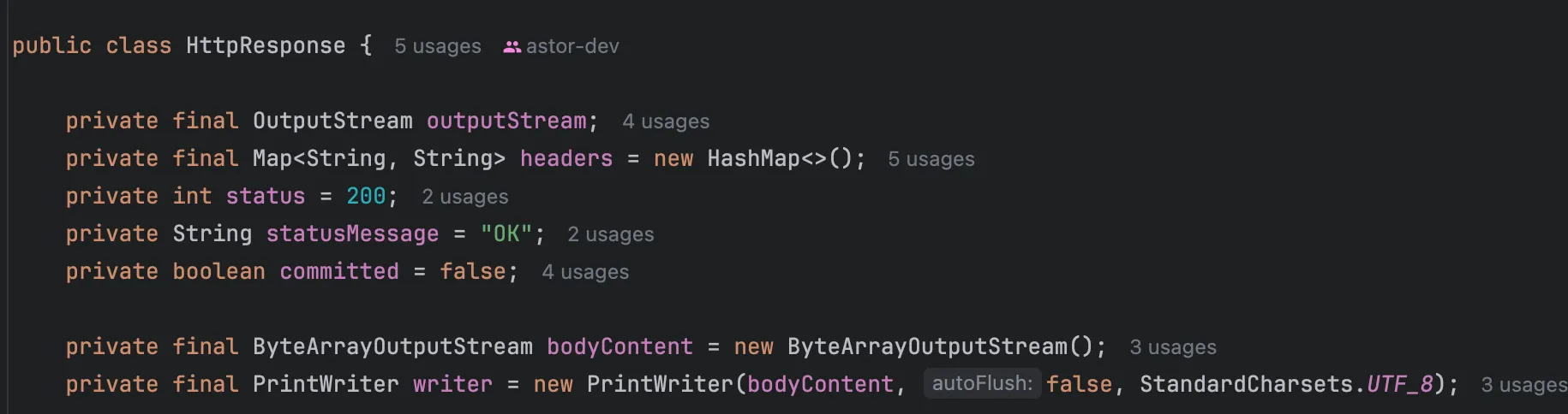 인스턴스 변수를 정의해둡니다. Body를 쓰기 위해 PrintWriter를 둡니다.