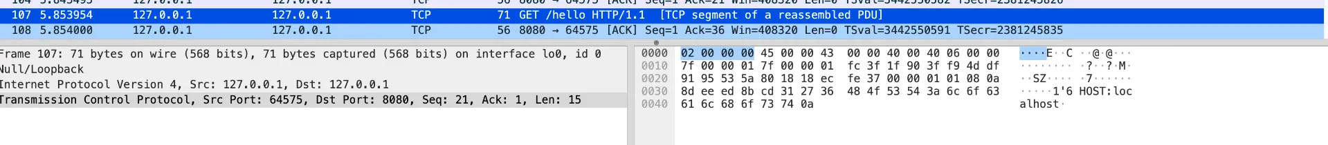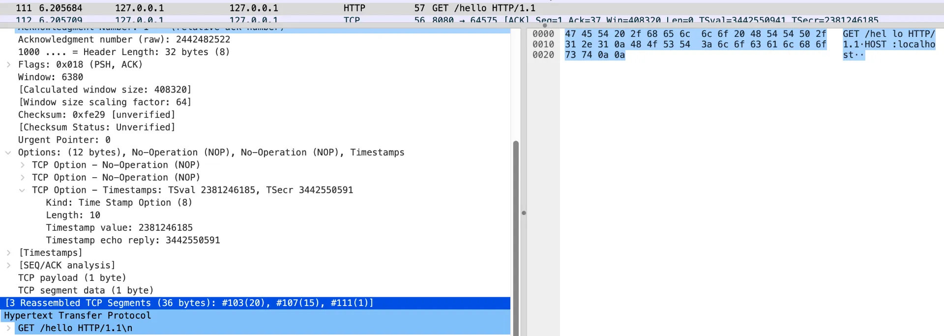 WireShark 프로그램에서는 마지막 개행문자 TCP 패킷이 전송되는 순간 이 3개의 TCP 패킷이 HTTP 규격을 준수했고, HTTP 규격의 끝(마지막 개행문자)을 식별해 HTTP 패킷으로 재조립해주어 보여줍니다.