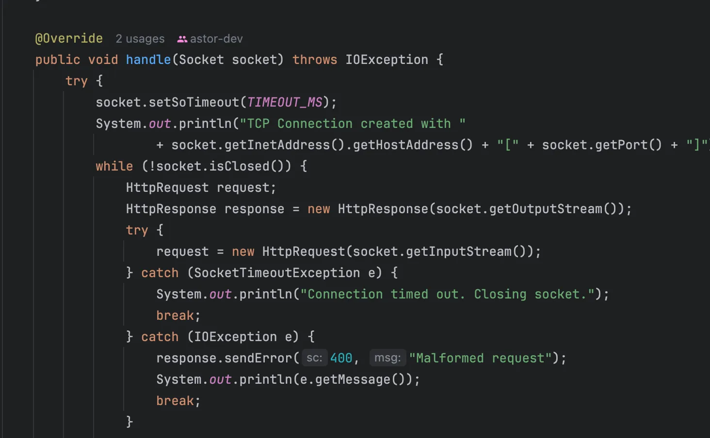 한번의 HTTP 통신을 마친 후 소켓을 닫아버리면 비효율적이기에 HTTP/1.1 명세의 KeepAlive를 구현해줍니다. 또한 url 별 처리 책임 분리를 위해 요청 핸들러에게 매핑또한 수행합니다.