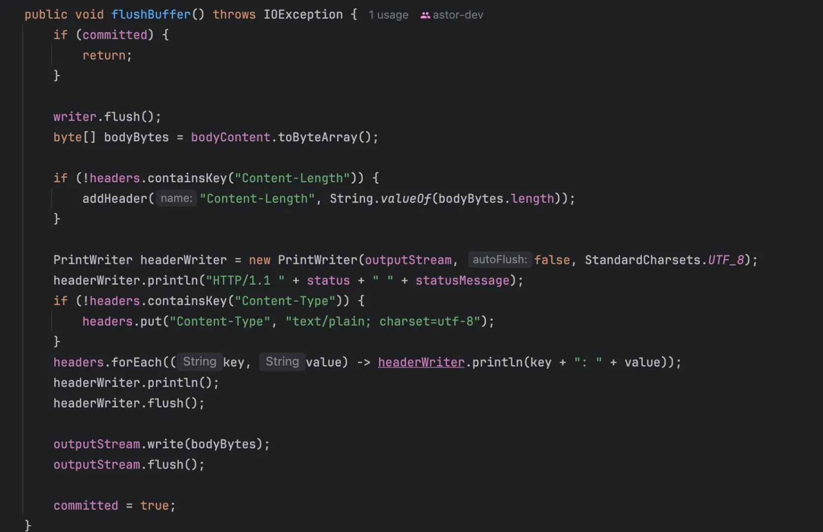 응답을 전송할 때 body의 길이를 받아 Content-Length를 써줍니다. 초기 응답 규격을 맞춘 후 헤더 Map의 Key Value들을 규격에 맞는 문자열로 쓰고 개행 후 Body또한 더해 전송합니다.