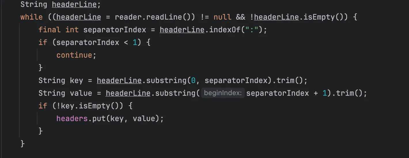 한줄을 읽었을 때 \r\n 이 나온다면 헤더 라인의 끝을 의미합니다. while 루프를 돌면서 파싱합니다.