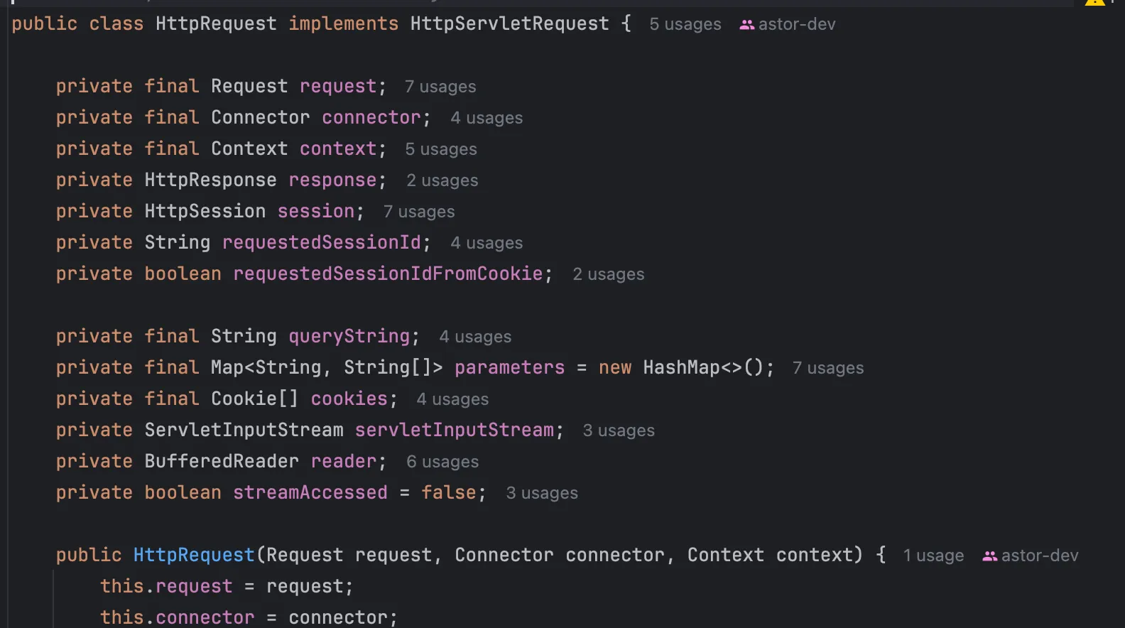 HttpRequest Class에서 bridge 계층에서 파싱한 Request와 Connector이 지닌 네트워크 커넥션 관련 정보, Context에 담긴 세션, ServletContext 등을 활용해 ServletAPI의 메서드들을 구현했습니다.